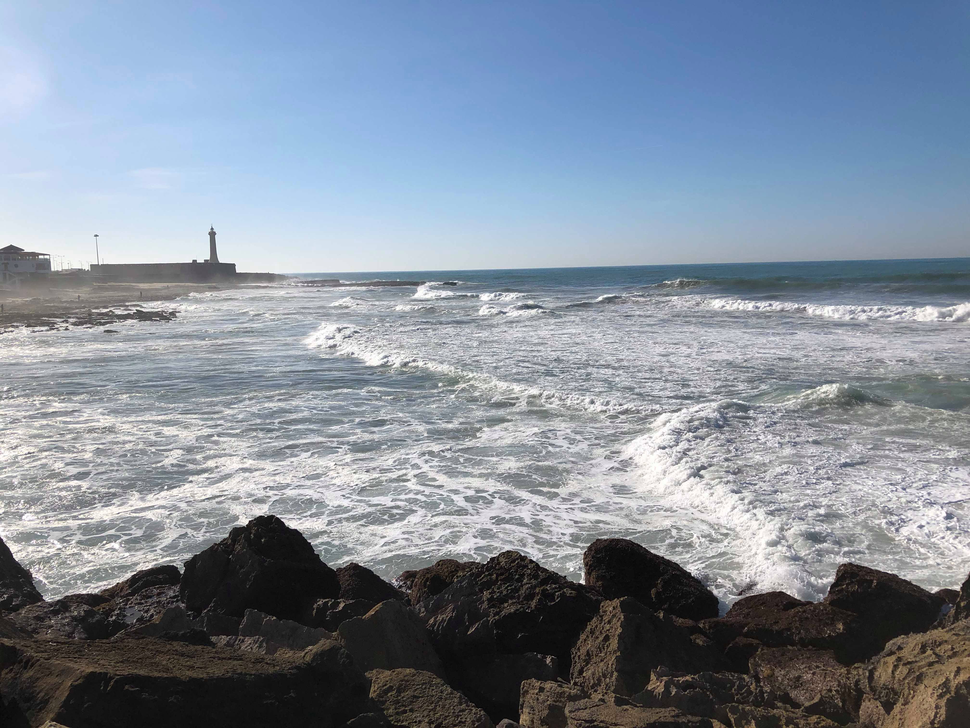 V Medině už jsme se dál nezdržovali, prošli jsme podobně jako včera do modrého městečka, chtěli jsme si to tam projít ještě jednou, za dne, když máme čas. Teď to tam bylo živější, děti si hrály na ulici a dokonce zase i pár turistických obchůdků. Tentokrát se mi podařilo vybrat cesty, které vedou k vrcholu kopce a nezabloudit ve slepých uličkách – ale trochu překvapení jsme vyšli na hlavnější ulici, do které jsme večer vstoupili horní bránou. Prošli jsme znovu do pevnosti na vyhlídku, teď nezaterasenou, koukali chvíli na rozbouřené moře a rohodli se sejít dolů, na malou promenádu, že si tam dáme kávu a budeme koukat do vln. Kavárny tam vypadají nově, jsou ale přitom dost omšelé, mořská voda jim asi dává zabrat. Dáváme si kávu a rezervujeme ubytování v Casablance. Ještě chvíli plánujeme co tam vidět s pomocí knižního průvodce a ještě vyrazíme se projít na vlnolam. Vlny tu mají velkou sílu. Sedáme si na kameny a koukáme do vln – působí trochu znervozňujícím dojmem, protože si uvědomujeme jejich ohromnou sílu. Nakonec přijde jedna, co nás lehce osprchuje – stejně už je čas vyrazit zpátky.