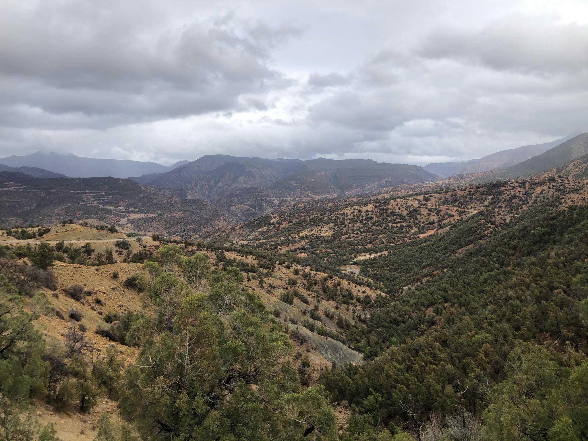 Od restaurace jsme už do navigace opravdu dali Essaouiru. V tu chvíli cesta ukazovala ještě něco přes 3 hodiny, i když to bylo jen necelých 100km. A opravdu – silničky byly menší a menší a postupně jsme nastoupali v jednom místě až do 1600m nad mořem (a do mraků) a pak zase sklesali dolů. Ale výhledy za to rozhodně stály! V jednom z nejvyšších míst jsme přejeli vrcholek kopce a tím se nám otevřel výhled na druhou stranu hor, než po které jsme jeli. Tam lehce prosvítalo sluníčko – svítilo do mraků tak, že celé údolí tam bylo zahalené v mlžné záři.