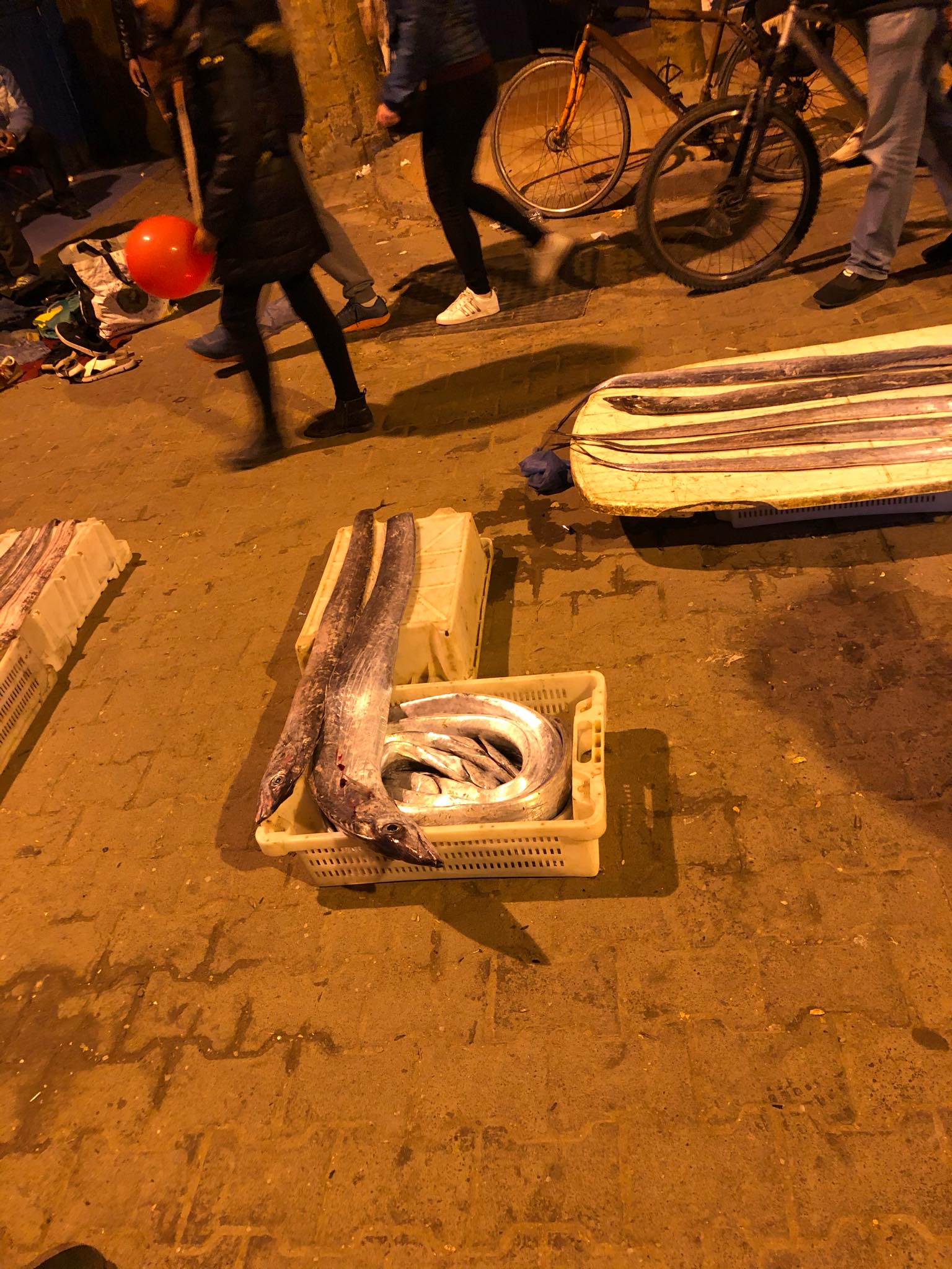 Když se trochu vyčasilo, vyrazili jsme směr rybí trh. Cestou jsme potřebovali vybrat hotovost z bankomatu – oba bankomaty, které jsme potkali, ale bohužel buď nefungovaly nebo přestaly fungovat po vložení mojí karty. Došli jsme ke vstupu do přístavu, dál nás ale nepustil pan policista – že je přístav komerční a že jako turisté máme jít do mariny (odkud jsme přišli). Hned vedle vstupu pak bylo mnoho stánků s rybími pochoutkami. Ze všech průvodců jsme ale vyčetli, že to je sice fajn místo na oběd pro místní, ale na turisty tam mají nasazené nesmyslné ceny (a to na plastových židličkách a na dešti), takže jsme se vydali směrem k centru.