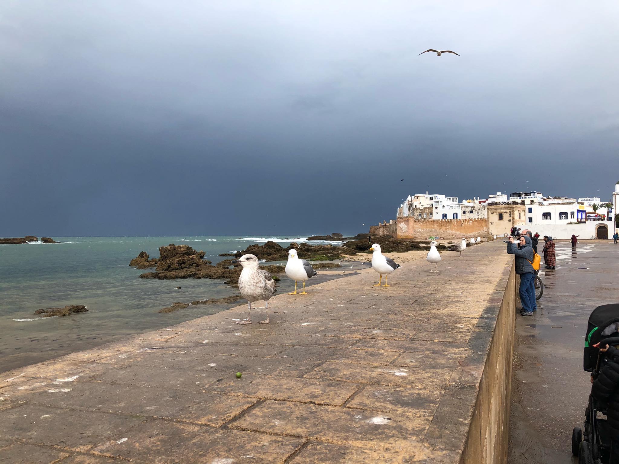Ráno nás přivítalo popletené počasí. Z jedné strany prosvítalo sluníčko, z druhé ale šly černé mraky. Navzdory tomu jsme po promenádě vyrazili směr centrum. Po pár desítkách metrech ale začalo pršet hodně, tak jsme zaparkovali do první kavárny a dali si kávu a croissant. Když už to vypadalo, že se počasí umoudří, tak jsme se vrátili na cestu. Došli jsme po pláži až do rybářského přístavu a mezitím prakticky přestalo pršet.