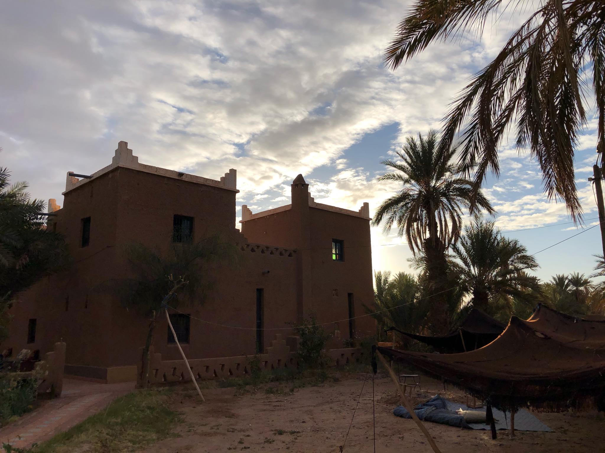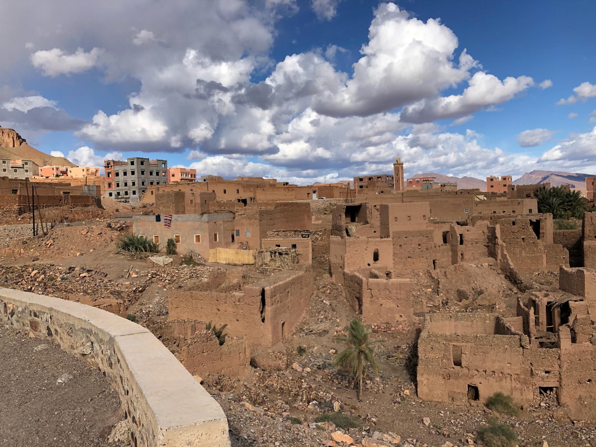 V jednom místě nám navigace už cestou na jih ukazovala odbočku na menší silnici, ale my jsme se rozhodli jet po hlavnější silnici (obě vypadaly na mapě stejně dlouhé). To bylo to místo, kde jsme viděli najednou pláň s palmami a kde byly neodbytné děti nabízející datle, poblíž Kazby Timiderte. Tentokrát jsme se tedy rozhodli jet po druhé straně. Byla to super volba. Projížděli jsme malými chudými vesničkami s tradičními hliněnými domky, kolikrát nalepenými na sobě. Spousta těchto domků je pak opuštěná – domýšlíme si, že tyto stavby moc nevydrží, jednoho dne prasknou nebo se sesypou a je jednodušší (levnější?) postavit nový domek o kus dál, než opravovat ten původní. Ale možná je to jinak – každopádně těch opuštěných je spousty a když je to celý ten shluk nalepený na sobě a ještě na kopečku, vypadá to jak zřícenina hradu. V jedné z vesniček zastavujeme v zatáčce, odkud je krásný výhled – na palmy, údolí a právě tento kontrast nových (zděných) a hliněných (i rozpadlých) domků. Fotíme i panorama a líbí se nám funkce 360 fotky, co z toho udělá messenger, protože z toho bude opravdu znát, jak to vypadalo.