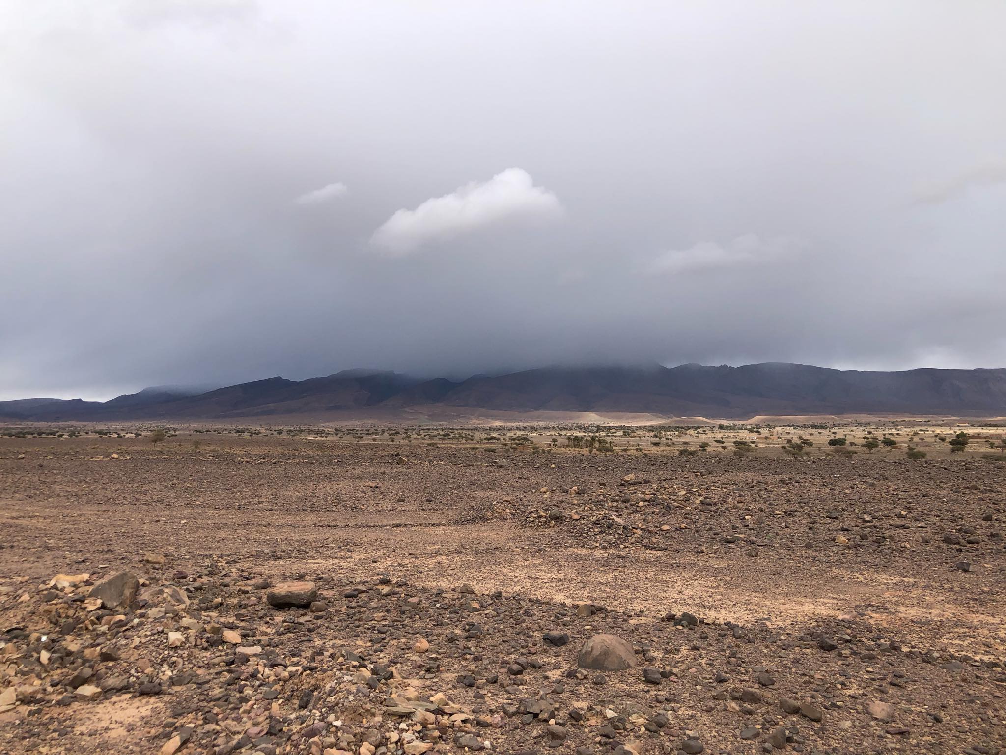 Začíná se zatahovat a v jednu chvíli dokonce prší. Nevydrží to dlouho, ale nějaká voda spadne. Nadšeně to fotíme, protože takový kousek od Sahary asi moc často neprší (soudě i podle kamenitého terénu téměř bez jakýchkoliv stromů).