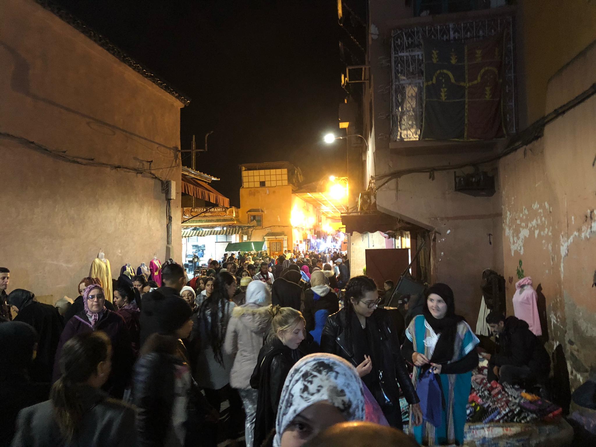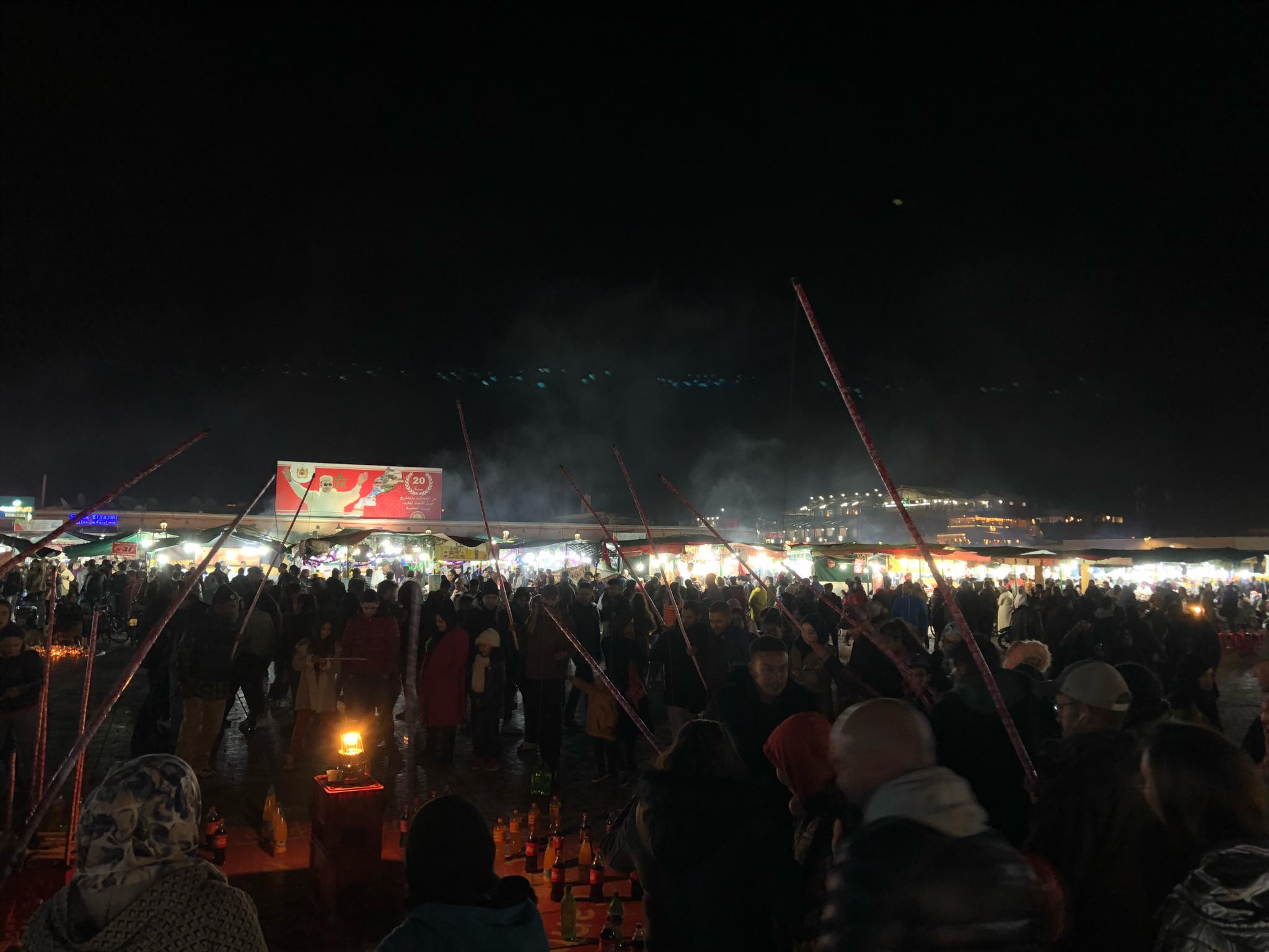 Zbývá nám poslední večer, takže jsme se chtěli podívat ještě jednou zpět na náměsti Jama El f’na, nejrušnější náměstí v Maroku. A taky že jo! Tentokrát to bylo mnohem rušnější, než když jsme tu byli skoro před dvěma týdny. Možná proto, že se teď v Marakéši běžel maraton – tak to asi přitáhlo víc turistů (poznali jsme podle stánku – a už odpoledne nás zaujalo, že jsme nějaké běžce potkali). Bylo tam i víc různých “představení”, chvilku jsme tam obdivovali mladé akrobaty, co byli úplně gumoví! Bylo tam i víc stánků s jídlem a tak. Tentokrát nám to už nepřišlo tak nepříjemné a vyčerpávající – prostě jsme si na tu živost Maroka zvykli.