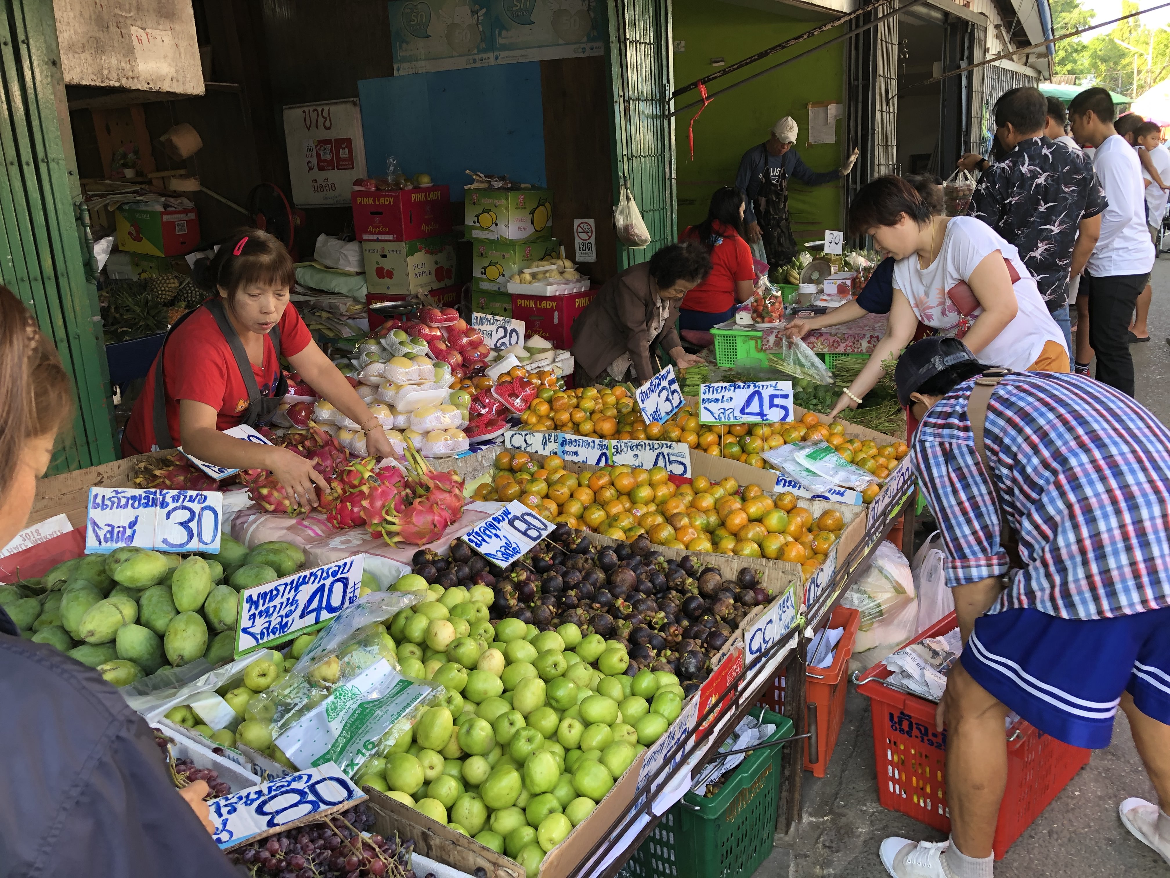 Náš hotel se nacházel na jižní straně centra a kousek od něj – vedle Chaing Mai Gate (Pratu Chaing Mai) probíhal ráno a večer velký trh s jídlem. Tam bylo možné koupit všemožné druhy ovoce, zeleniny, masa a i hotových jídel.