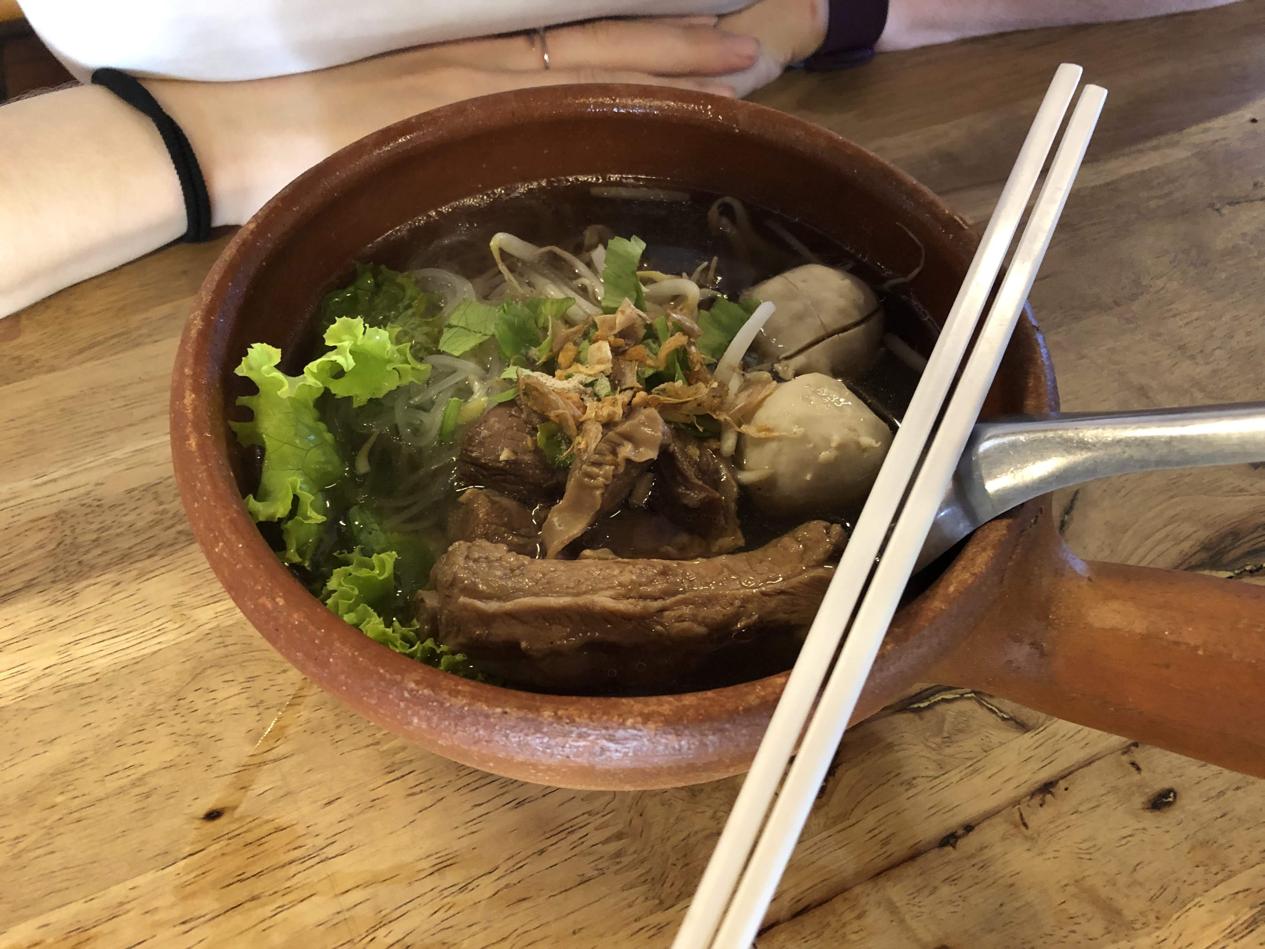 Cestou jsme také poprvé výrazněji vyzkoušeli místní stravu – dali jsme si ke snídali silný vývar a nudle s masem. Stejně jako u trhu jsou ceny jídla velice rozumné – v obyčejných restauracích nebo stáncích lze pořídit porci jídla od 40 do cca. 80 THB (~30 – 60Kč),  v lepších nebo turistických restauracích jsou typicky nejdražší jídla okolo 150THB.